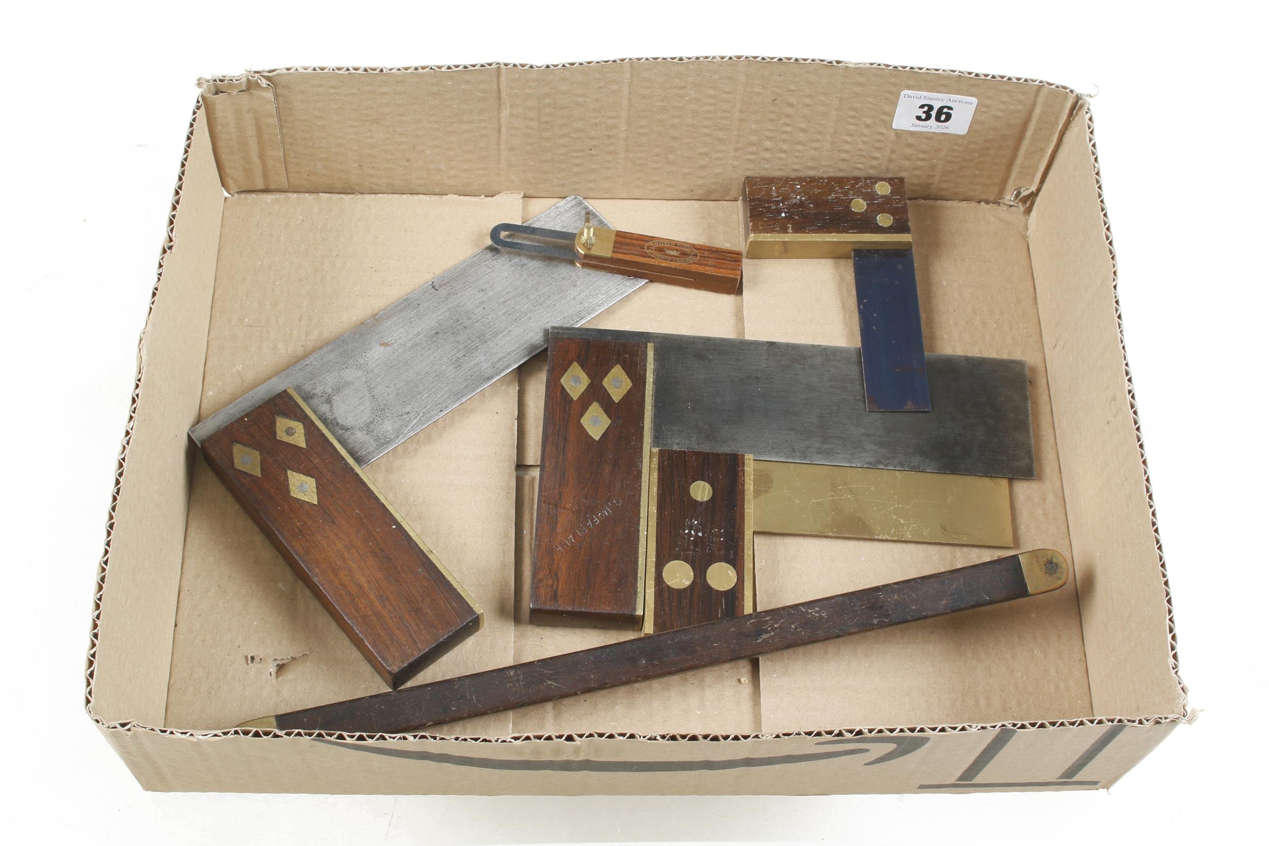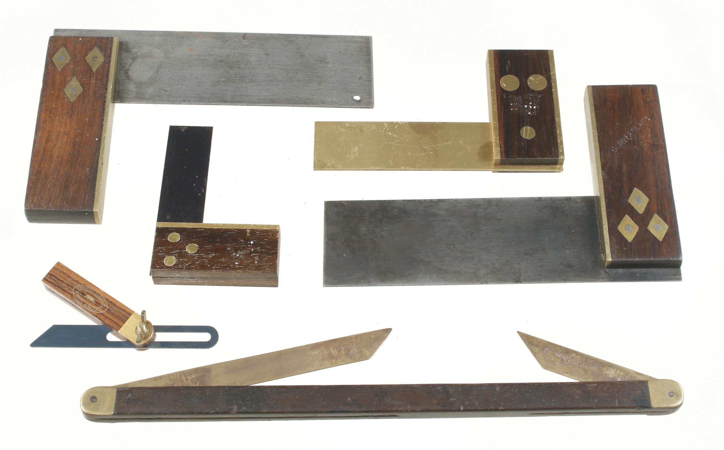 A boatbuilder's rosewood and brass bevel and 4 squares G+
