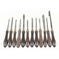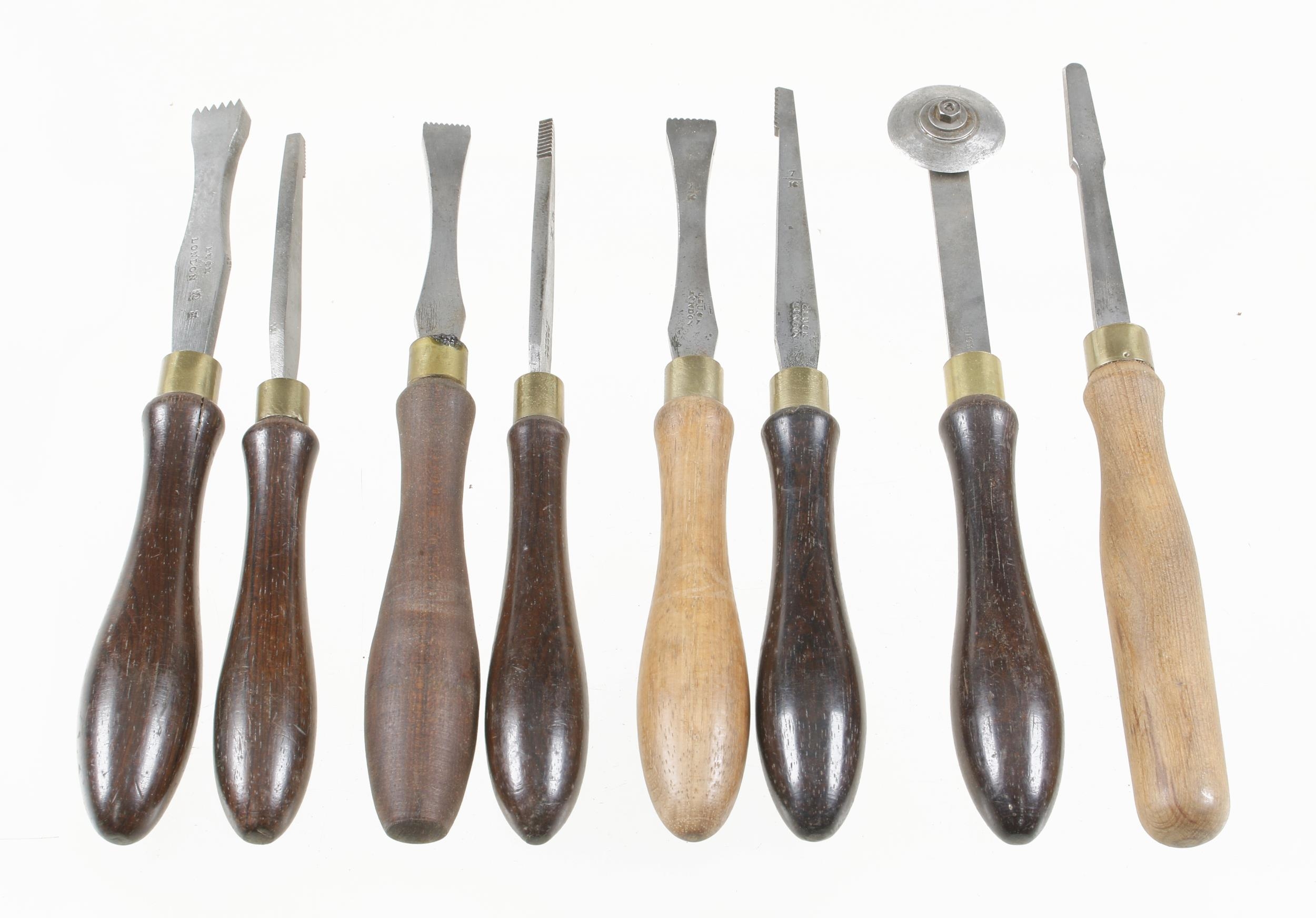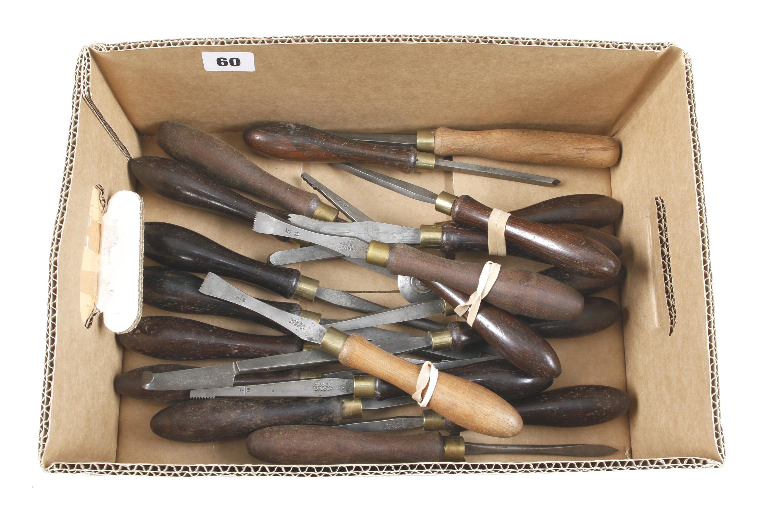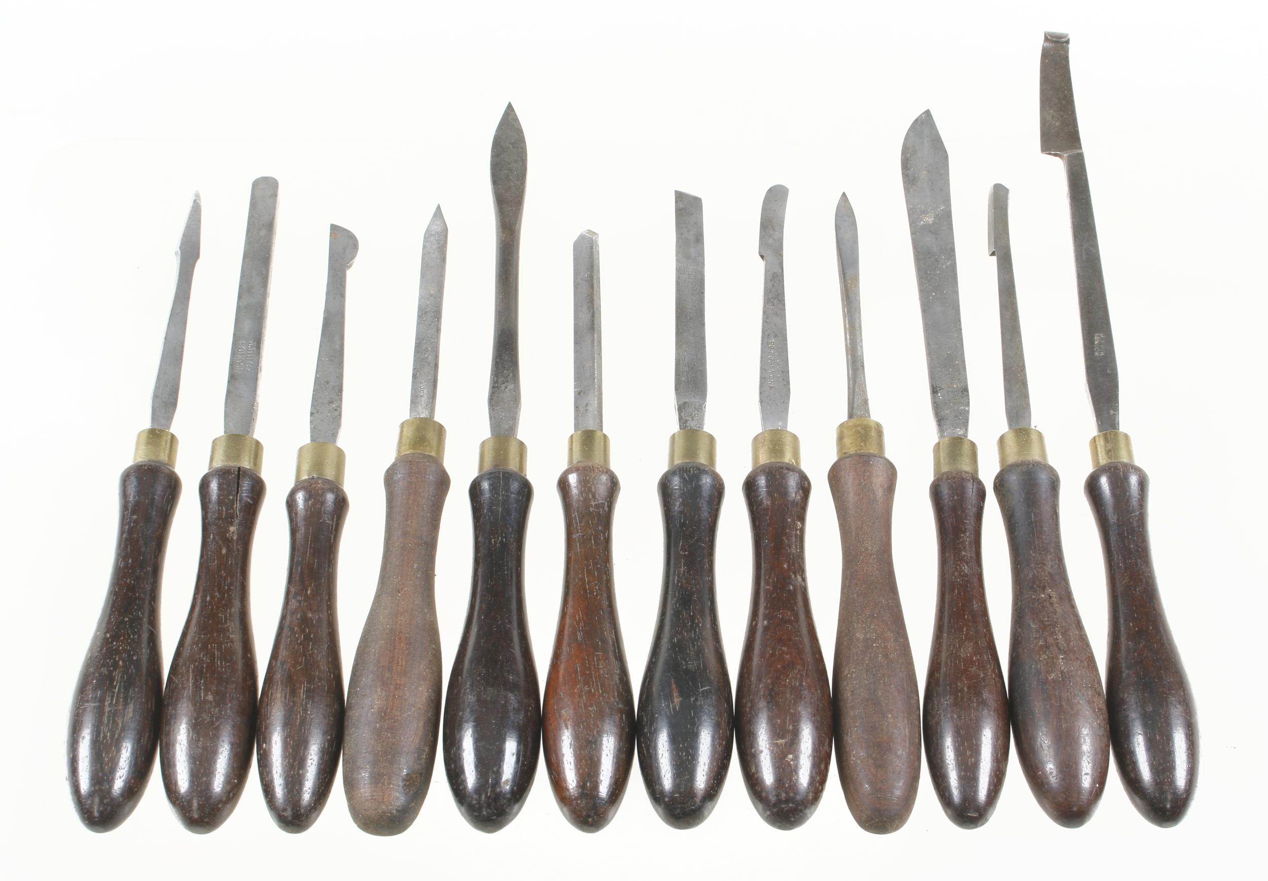 14 ornamental turning tools and 3 pairs of thread chasers all by J.BUCK with rosewood handles G++